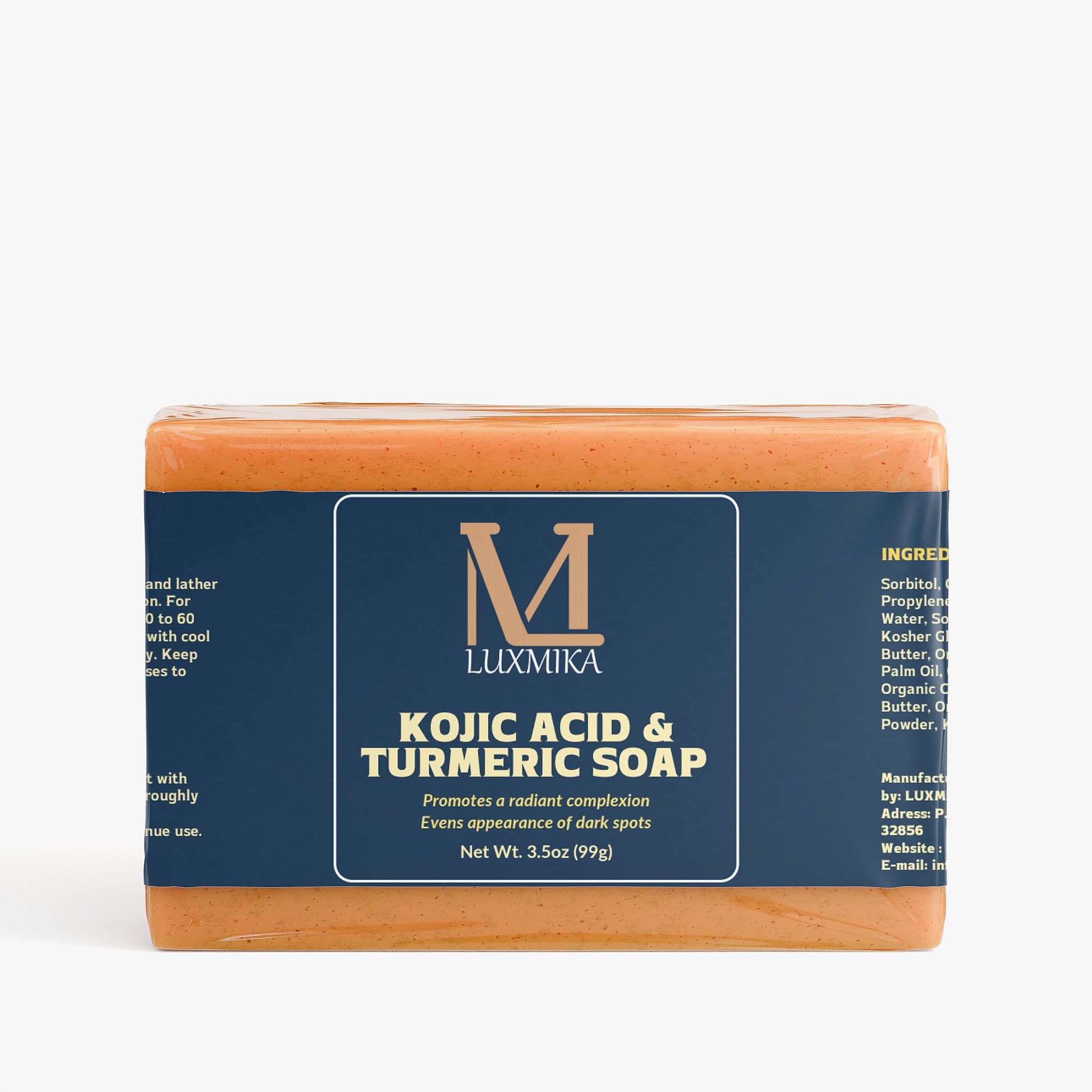 Ingredients: Sorbitol, Organic Coconut Oil, Propylene Glycol, Stearic Acid, Water, Sodium Hydroxide, Kosher Glycerin, Organic Shea Butter, Organic Sustainable Palm Oil, Organic Lemon Oil, Organic Cocoa Butter, Mango Butter, Organic Turmeric Powder, Kojic Acid.